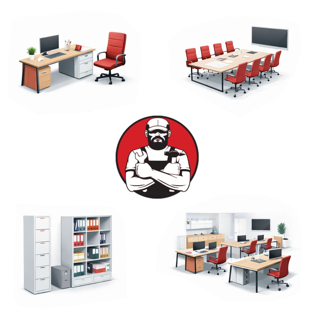 Montaža ergonomskih radnih stolova, kompjuterskih stolova, stolova sa fiokama i integrisanim kablovima. Sklapanje kancelarijskih stolica sa mehanizmima za podešavanje visine i naslona.
